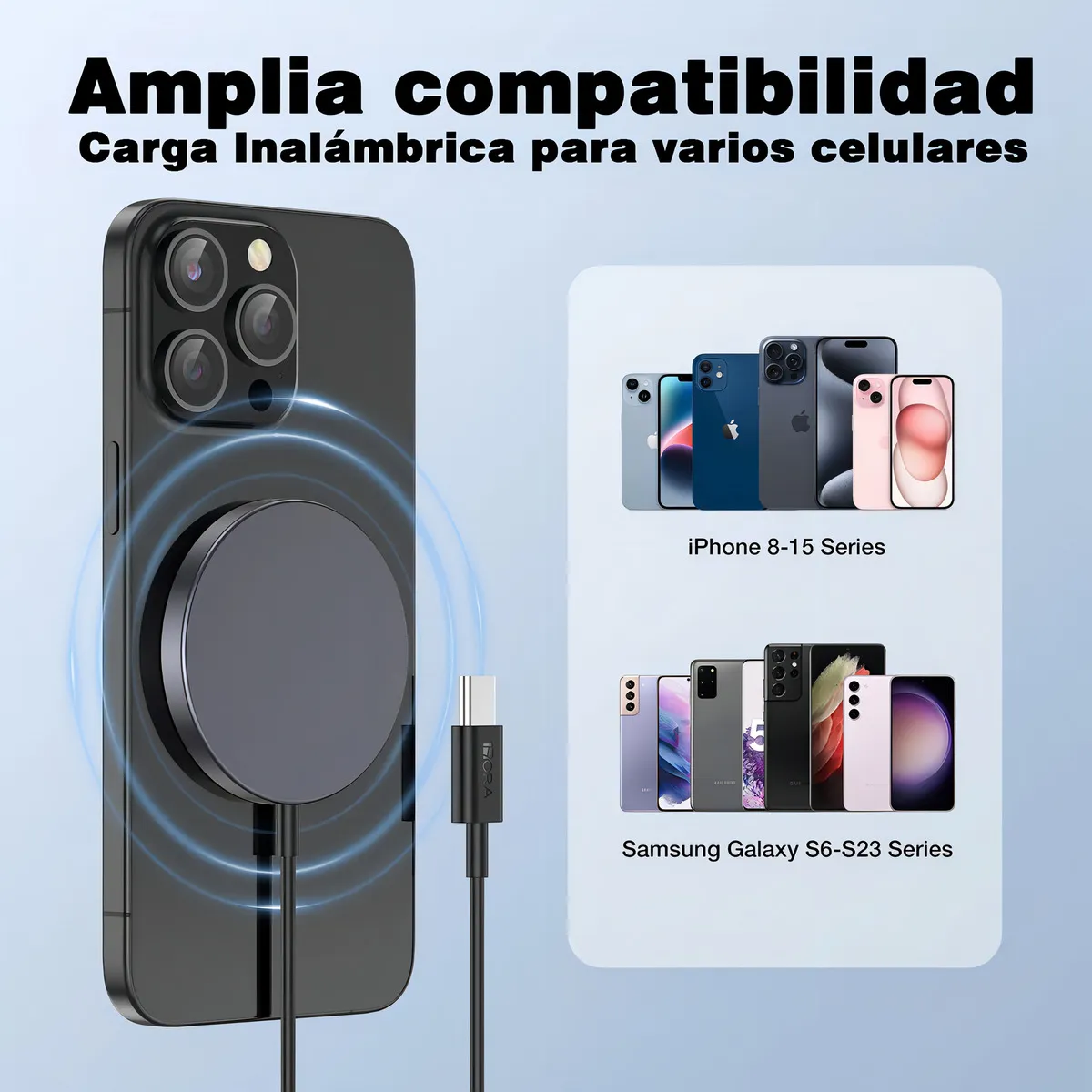 Compatible con una amplia gama de marcas y modelos, incluyendo Google, Huawei, iPhone, Motorola, Samsung y Xiaomi, este cargador se adapta a tus necesidades. Su diseño inalámbrico elimina la necesidad de cables enredados, brindando comodidad y estilo a tu espacio.